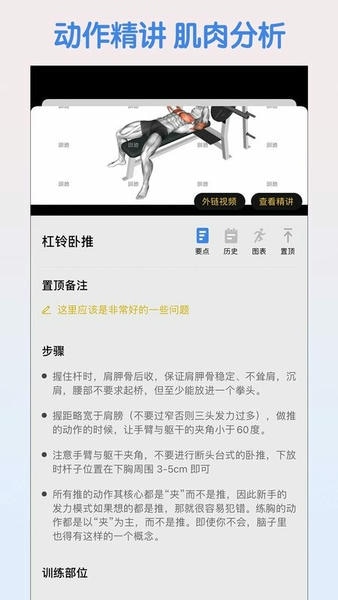 这是一款具有所有健身功能软件,简单明了的操作风格,实时为你记录训练的数量,当你健身结束一组训练时,会自动帮你添加下一组,智能化帮你规划好每天要做的训练,帮助你获得锻造更完美的身体!
