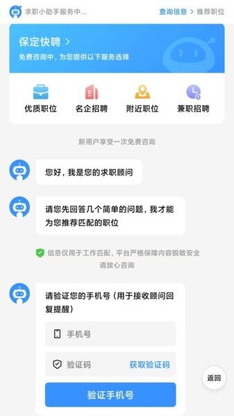 平台对入驻企业进行资质审核,标注“认证”标识,有效降低虚假招聘、乱收费等风险,让求职更安心。求职小助手在聊天界面也会提示注意事项,守护你的求职安全。