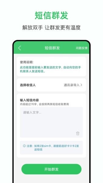 支持从通讯录导入联系人,提前编辑短信内容,自动批量向手机联系人发送短信,并可选择不同SIM卡,适合通知、提醒和营销推广使用。