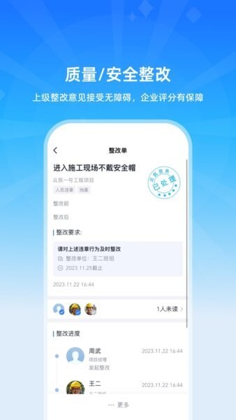 针对施工现场发现的安全与质量隐患,软件提供整改记录和跟踪功能,上级管理可下发整改指令,班组及时反馈整改结果,形成闭环管理。
