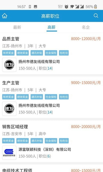 6、职位搜索,自我搜索职位的时候电线电缆行业的全部职位都能找到;