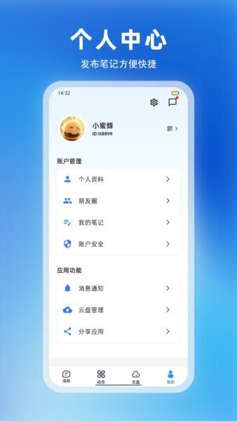 个人中心不仅包含账户信息维护,还支持笔记的发布与管理。用户可以快速创建内容,记录生活、工作灵感或备忘事项。该模块操作便捷,界面一目了然,帮助用户高效管理个人资料与创作内容,提升使用体验的同时增强软件的实用价值。