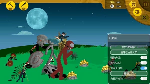 火柴人999999金币和999999钻石破解版内置作弊菜单,可以根据自己的需求进行修改,无限钻石的同时还可以免费召唤士兵,包括了僵尸、泰坦巨人等,有需要的欢迎下载。