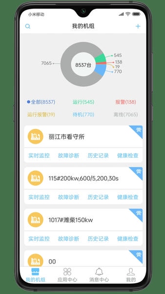 这是一个为发电机组提供健康监测和维保服务的云平台APP,发电机组通过硬件连接到云平台服务器,通过采集器机组运行的数据和实施状态,分析机组的潜在故障,让用户及时做好维护保养工作,让发电机组也享受着健康生活。