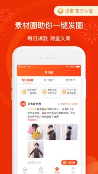 在贝省中,用户可以看到明显的优惠券领取入口,高额返利提示标志,以及方便快捷的订单管理模块。素材圈功能支持用户一键复制爆款文案,快速分享到各大社交平台,适合喜欢通过分享推广获得佣金的用户。此外,签到、邀请好友获得奖励等日常福利入口也显著可见,使得贝省不仅是一个购物返利工具,更是一个生活省钱与社交分享结合的平台。