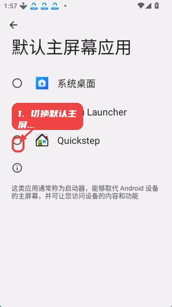 在默认主屏幕应用设置界面,选择Quickstep对应的单选按钮,即可将其设为系统默认启动器,方便日常使用。