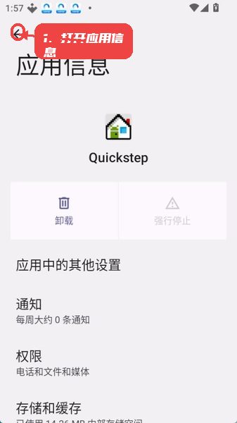 软件首页清晰展示了多个功能入口,如应用信息、通知管理、权限设置、存储缓存和默认主屏幕应用配置。用户通过点击对应栏目即可进入详细设置界面,例如切换通知总开关或管理支持的链接打开权限,操作直观便捷。默认主屏幕应用的切换入口也明确标示,方便用户根据需求调整主屏幕应用体验。整体来看,Quickstep不仅是一款应用管理工具,更是手机个性化配置的重要帮手,兼顾实用性与便捷性。